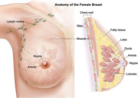 It generally begins in the milk-producing glands (lobular cancers), or in the ducts that carry milk from the lobules to the nipple (ductal cancers). Sometimes, it begins taking shape in the fatty and fibrous connective tissue of the breasts. See the breast anatomy in the pictures below.